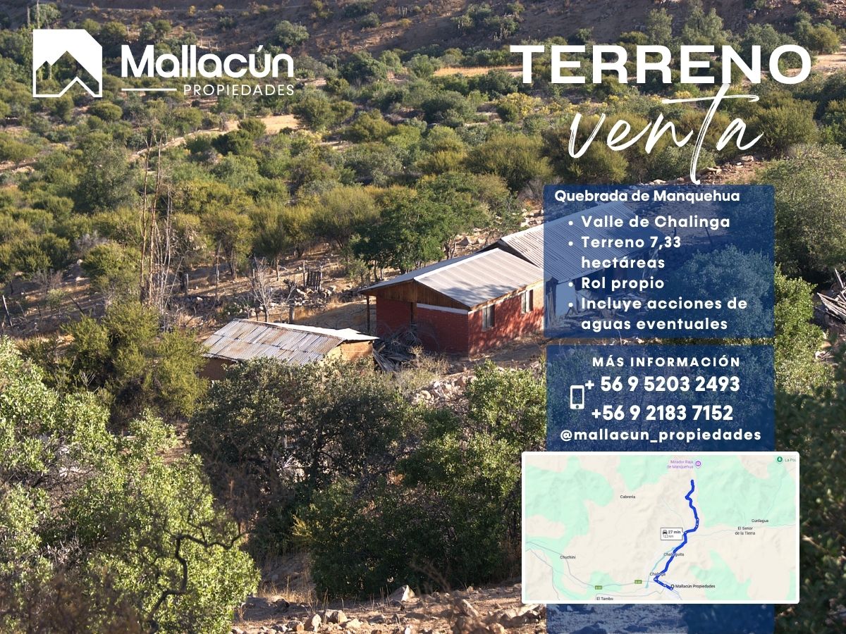 Mallacún Propiedades ofrece en venta una parcela agrícola de 9,468 hectáreas de tierra fértil, ubicada en el sector de Quebrada de Manquehua, en pleno Valle de Chalinga, comuna de Salamanca. Una propiedad con gran potencial para proyectos agrícolas o de inversión en la naturaleza.