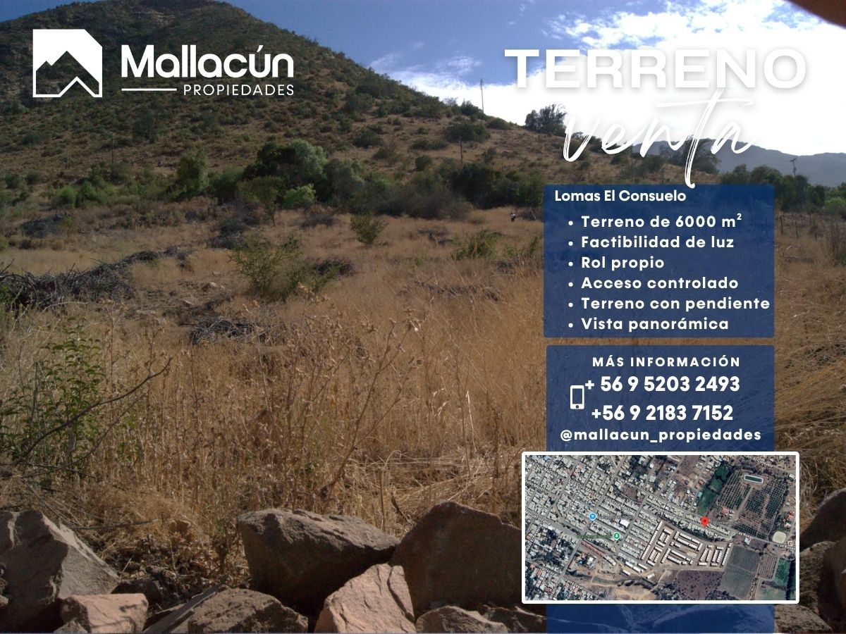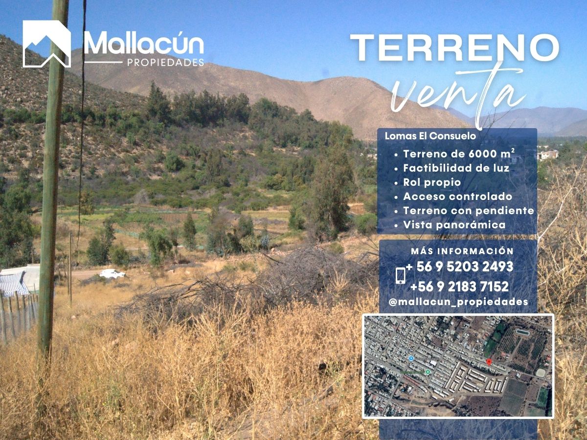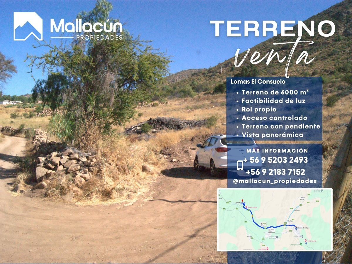 Mallacún Propiedades ofrece en venta un terreno de 6.000 m², ubicado en el sector de El Consuelo, comuna de Salamanca. Una propiedad con gran potencial para desarrollo habitacional o de inversión, en un entorno natural privilegiado y con excelente conectividad.