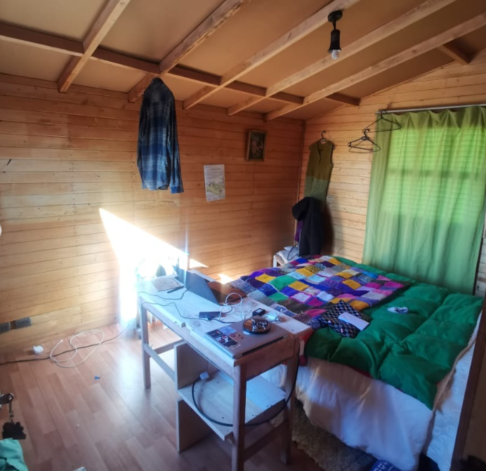 Construcción con revestimiento interior de tinglado traslapado, pisos de madera y techumbre de panel aislado de acero estructural OS-4, que alberga 2 dormitorios, 1 baño y una cómoda sala de estar.