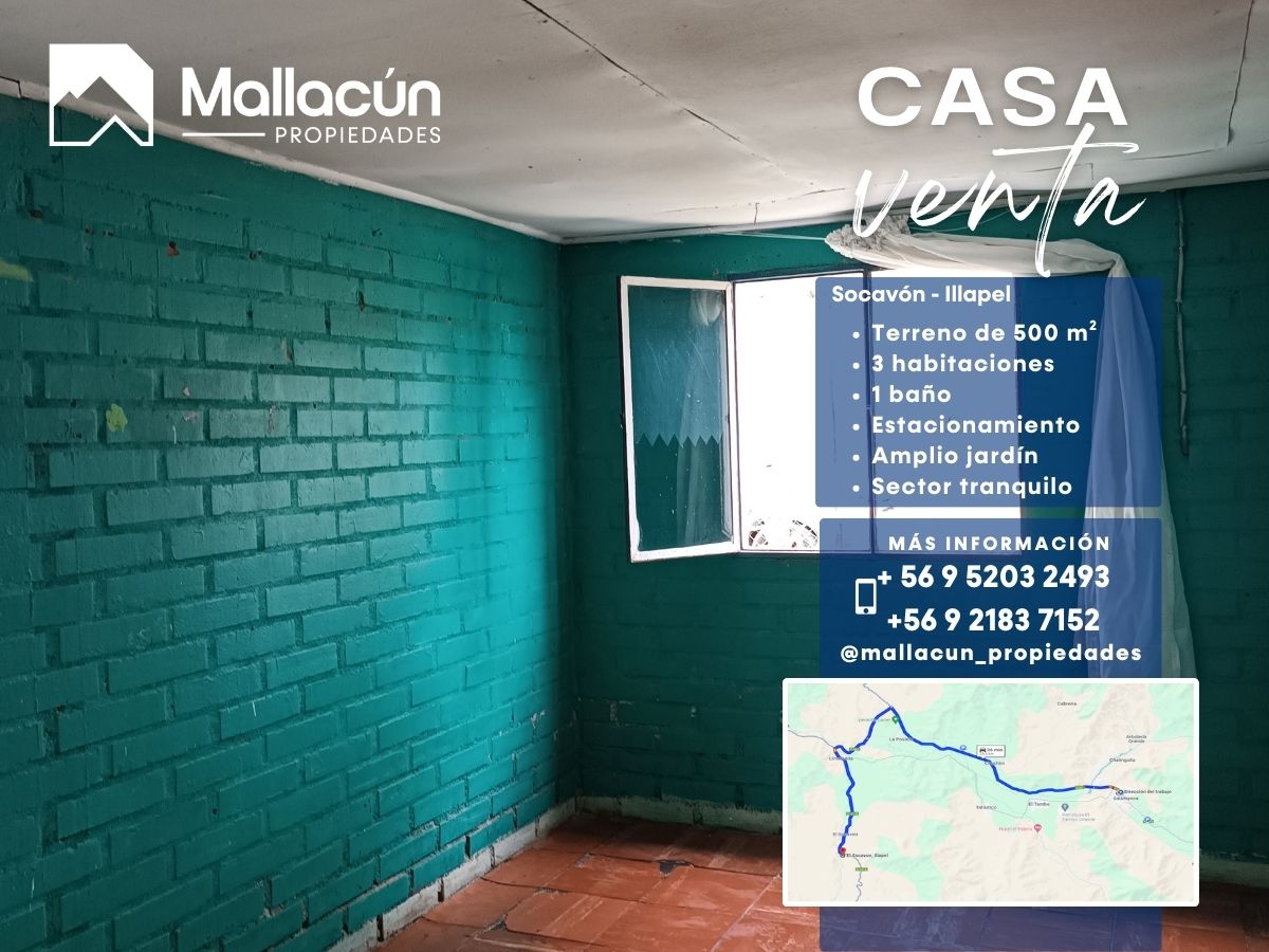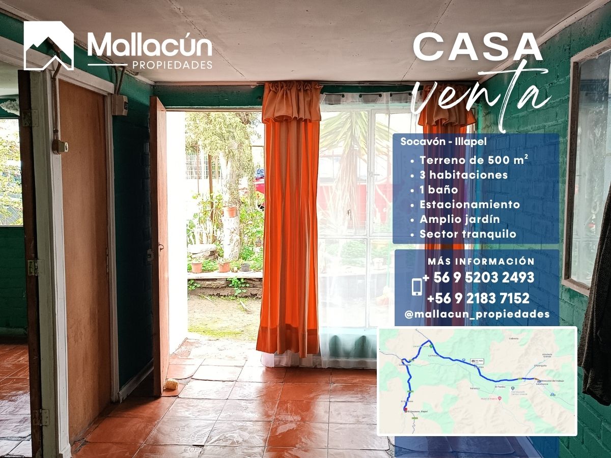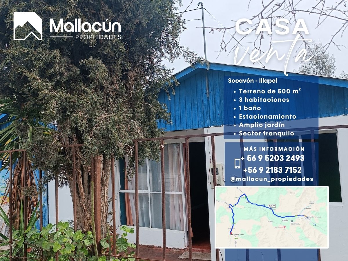 Mallacún Propiedades ofrece en venta una casa de 70 m² ubicada en la localidad de Socavón, a solo 31 minutos de Illapel y 36 minutos de Salamanca. Una propiedad ideal para quienes buscan un hogar acogedor y tranquilo, rodeado de naturaleza y con espacio para toda la familia.