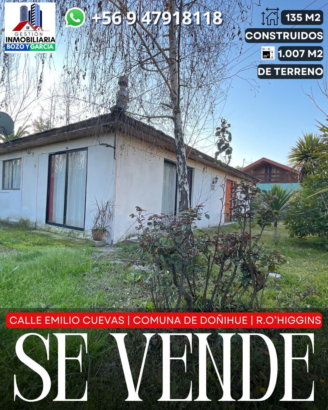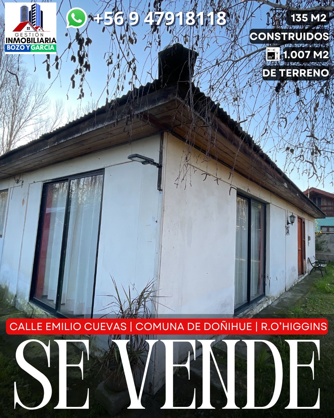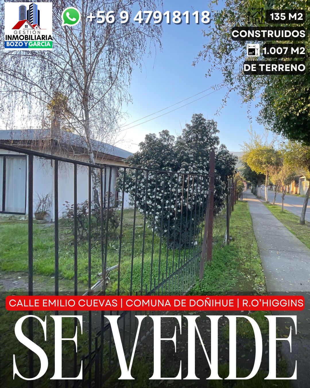 Tenemos a la venta una propiedad en la comuna de Doñihue, en la calle Emilio Cuevas. Una de las arterias principales de la comuna, en esta avenida esta ubicada la notaria y conservador de bienes raíces, a pasos de importantes supermercados, colegios y centro cívico de la comuna.