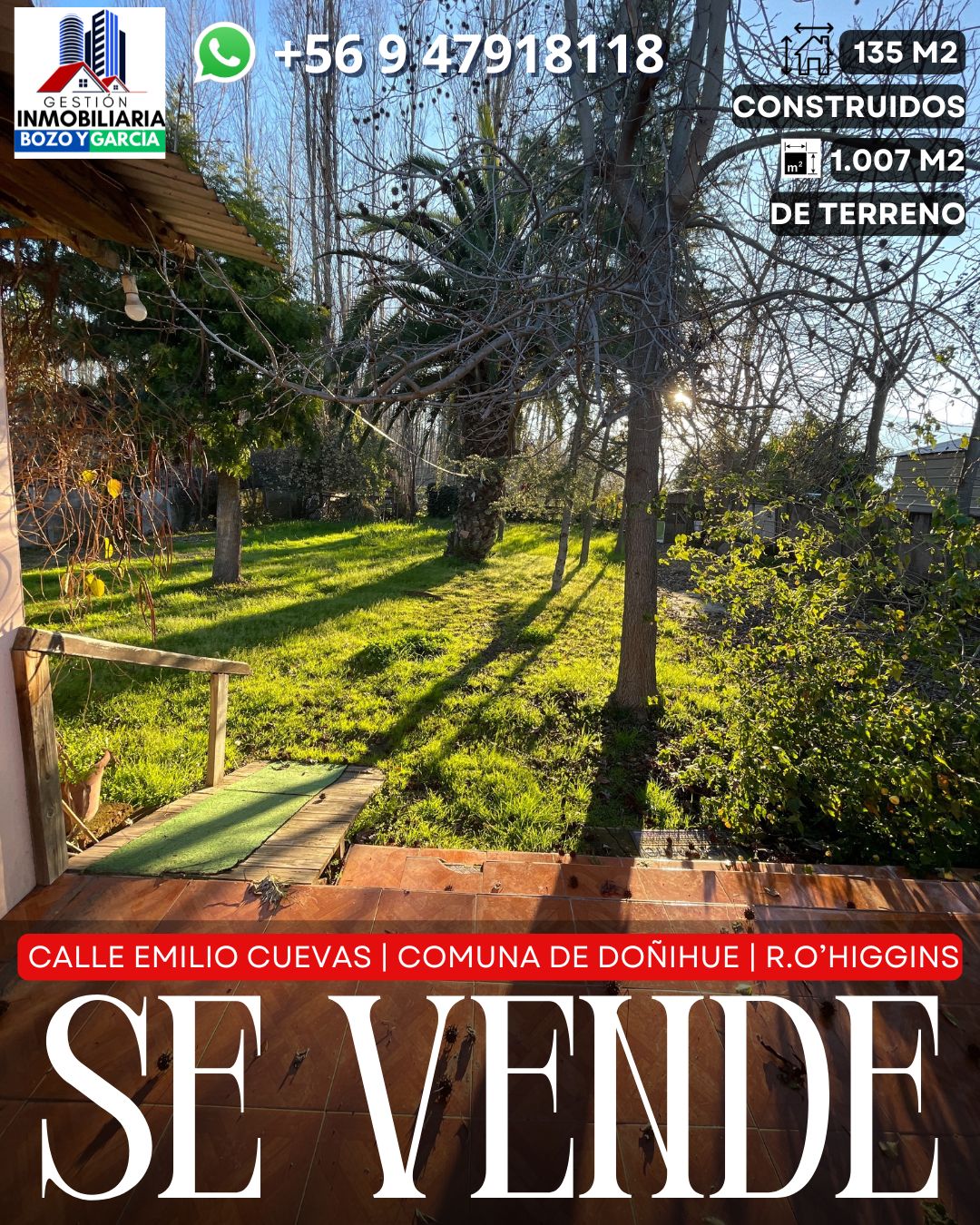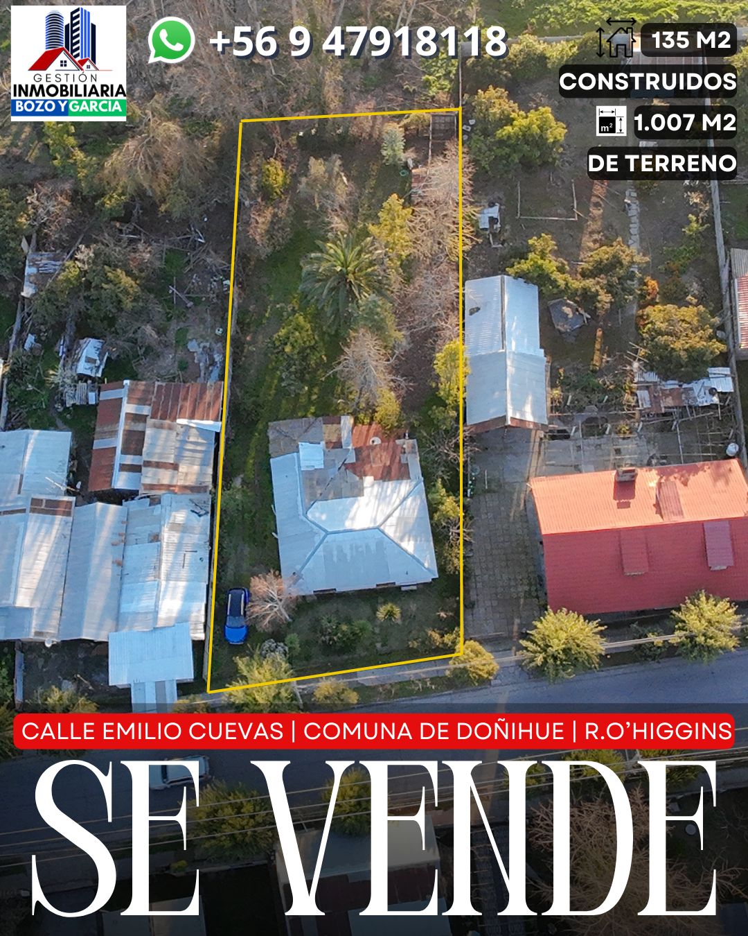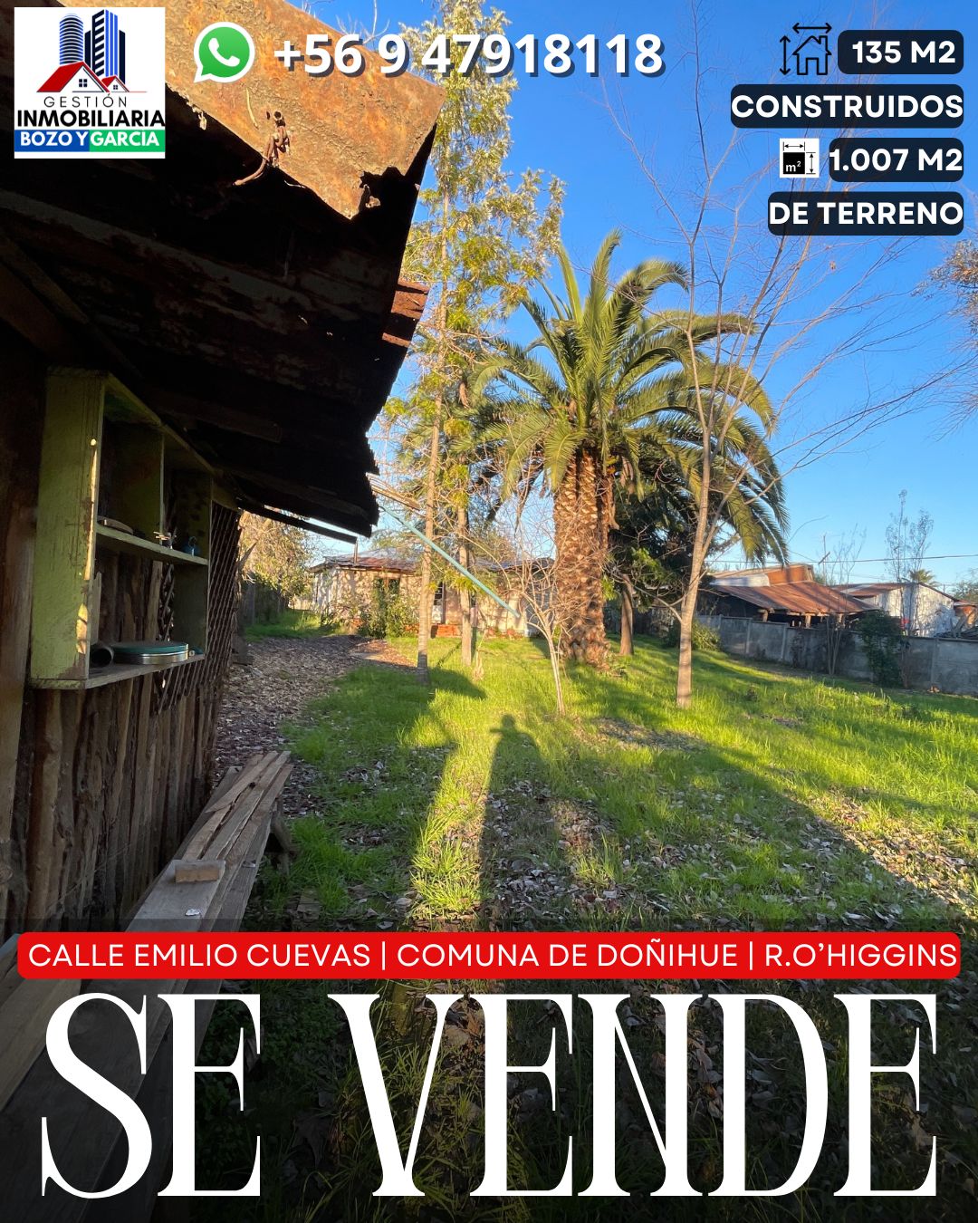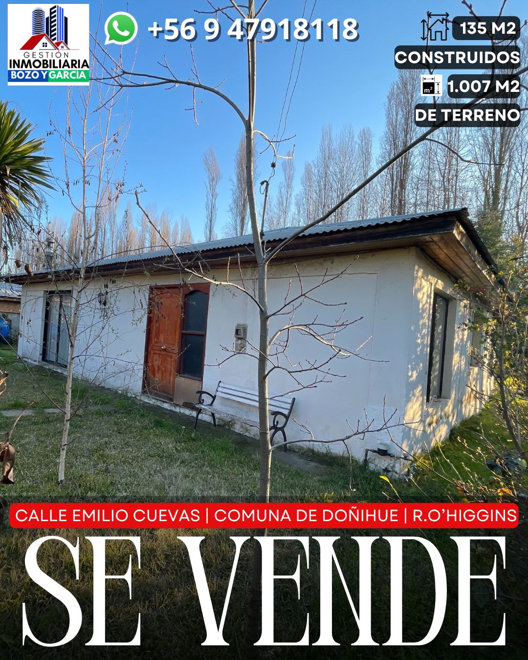Tenemos a la venta una propiedad en la comuna de Doñihue, en la calle Emilio Cuevas. Una de las arterias principales de la comuna, en esta avenida esta ubicada la notaria y conservador de bienes raíces, a pasos de importantes supermercados, colegios y centro cívico de la comuna.